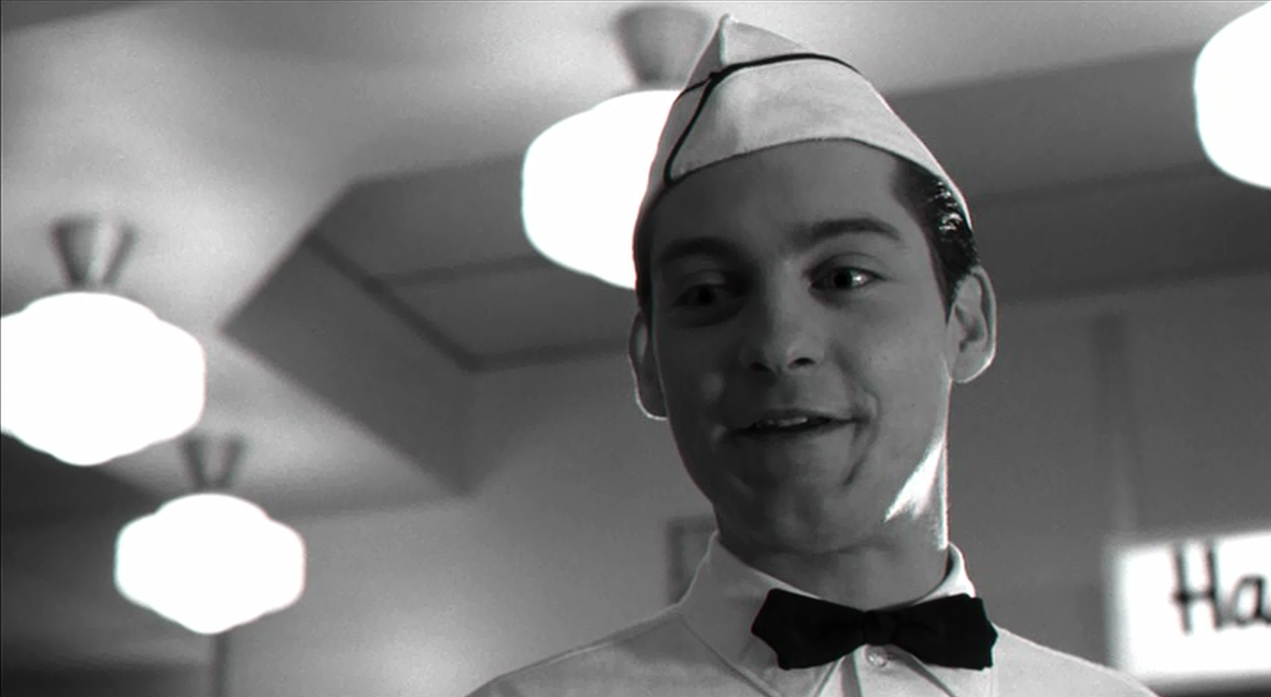 The summary of the movie Pleasantville from IMDB: A brother and sister from the 1990s are sucked into their television set and suddenly find themselves trapped in a 1950s style television show. Here they have loving parents, old fashioned values, and an overwhelming amount of innocence and naiveté. Not sure how to get home, they integrate themselves into this “backwards” society and slowly bring some color to this black and white world. But as innocence fades, the two teens begin to wonder if their 90s outlook is really to be preferred.