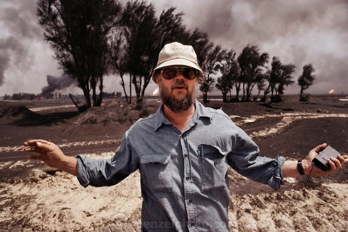Author Tim Cahill in the South Al-Burgan Oil field, Kuwait. More than 700 wells were set ablaze by retreating Iraqi troops creating the largest man-made environmental disaster in history.
